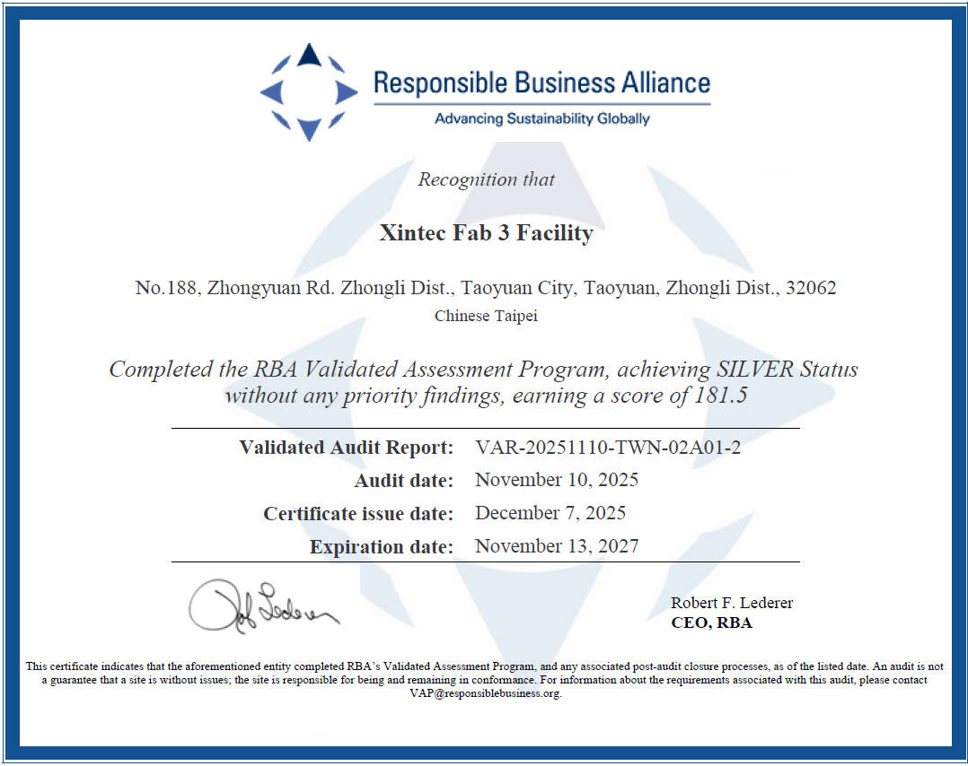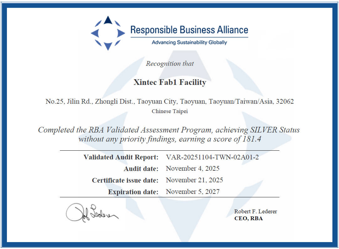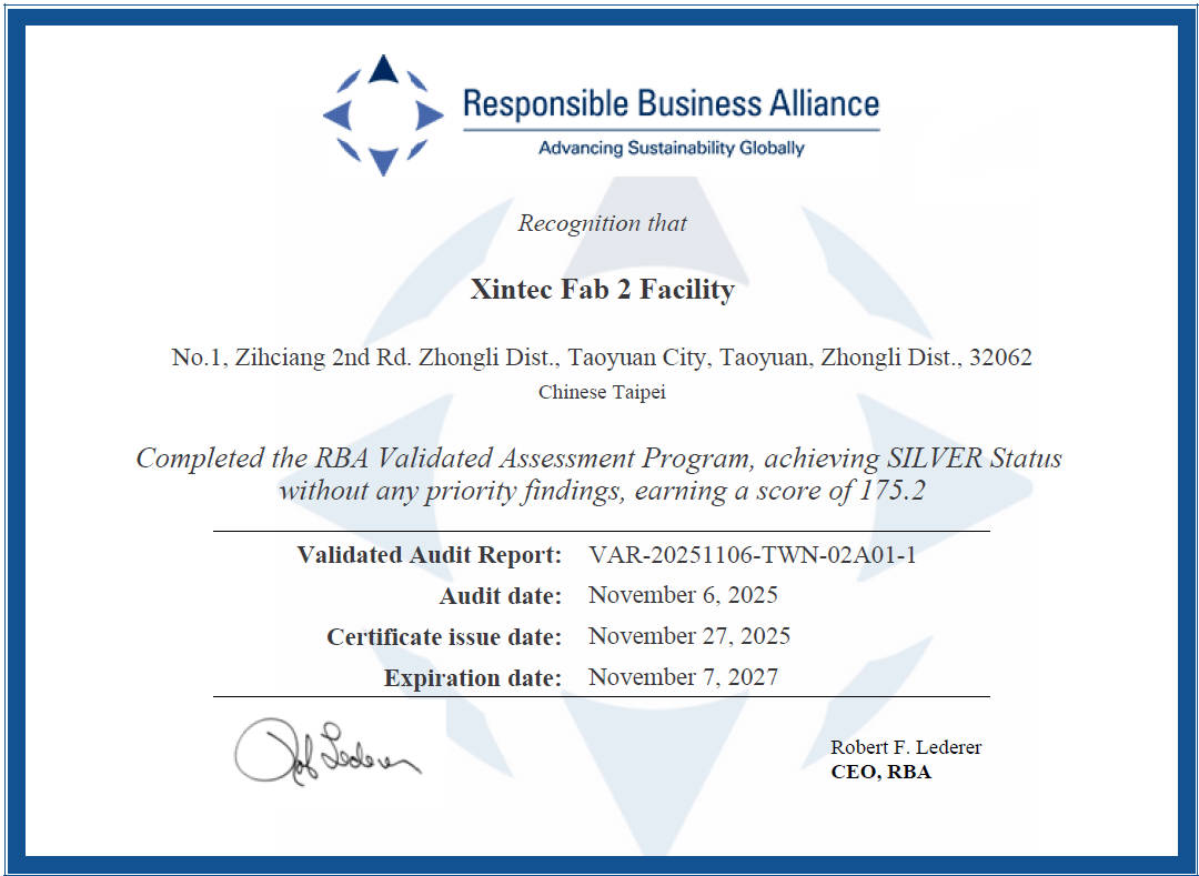Xintec Inc. actively promotes the standards of the RBA Code of Conduct, continuously improving labor, health and safety, environmental, ethical, and supply chain management issues, creating a sustainable business environment. In 2025, Line B completed its RBA VAP and obtained a Silver Certificate.